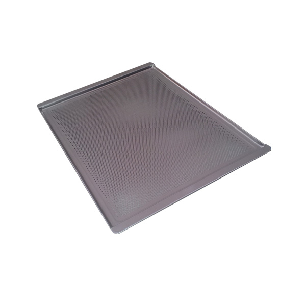 Pekač aluminijasti 330x460 mm perforiran z 4 robi 10 mm. Perforiran pekač omogoča lažji prenos toplote na proizvod.